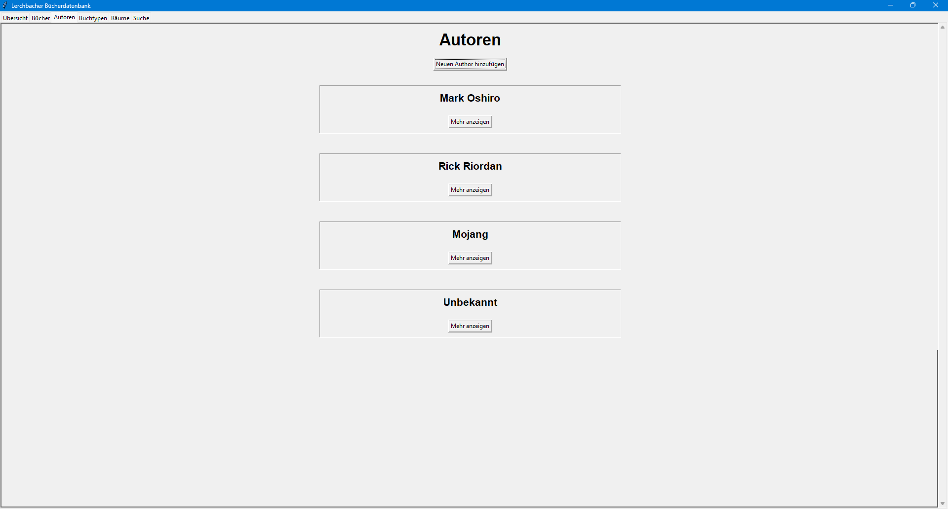 Der Autoren Tab enthält eine Liste alle Autoren, die in der Datenbank gespeichert sind. Ebenfalls findet sich dort die Möglichkeit, neue Autoren hinzuzufügen. Auch hier lassen sich Autoren über den "Mehr anzeigen" Knopf ausklappen. Dadurch werden mehr Informationen und Optionen angezeigt, wie etwas "Bearbeiten" und "Löschen".