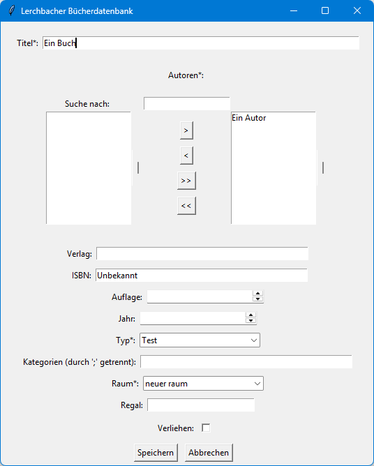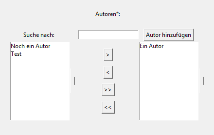 > Knopf verschiebt alle markierten Autoren von der linken auf die rechte Seite.< Knopf verschiebt alle markierten Autoren von der rechten auf die linke Seite.>> Knopf verschiebt alle Autoren von der linken auf die rechte Seite, egal ob gewählt oder nicht.<< Knopf verschiebt alle Autoren von der rechten auf die linke Seite, egal ob gewählt oder nicht.Hier könne Sie den Verlag / Herausgeber des Buches eintragen