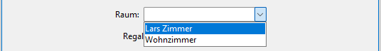 Dieses Feld speichert den Raum des Buches. Dieser kann aus der Liste gewählt werden, die beim Klicken auf den kleinen Pfeil rechts angezeigt wird. Bitte prüfen Sie vor Erstellen des Buches, ob der gewünschte Raum bereits existiert (7. Räume) Das Feld verfügt ausserdem über eine Autovervollständigung für die möglichen Räume. Sie können also den Anfang eines Raumes eingeben und bekommen einen Vorschlag zur Vervollständigung.