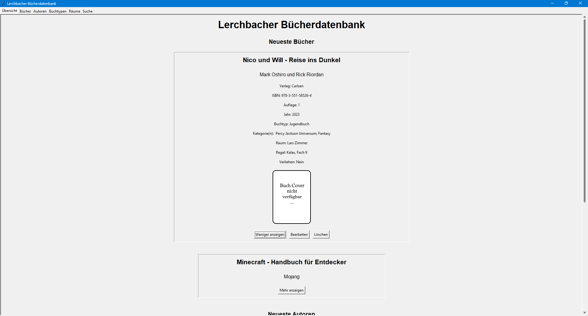 Der Bücher Tab enthält eine Liste alle Bücher, die in der Datenbank gespeichert sind. Ebenfalls findet sich dort die Möglichkeit, neue Bücher hinzuzufügen. Auch hier lassen sich Bücher über den "Mehr anzeigen" Knopf ausklappen. Dadurch werden mehr Informationen und Optionen angezeigt, wie etwas "Bearbeiten" und "Löschen".