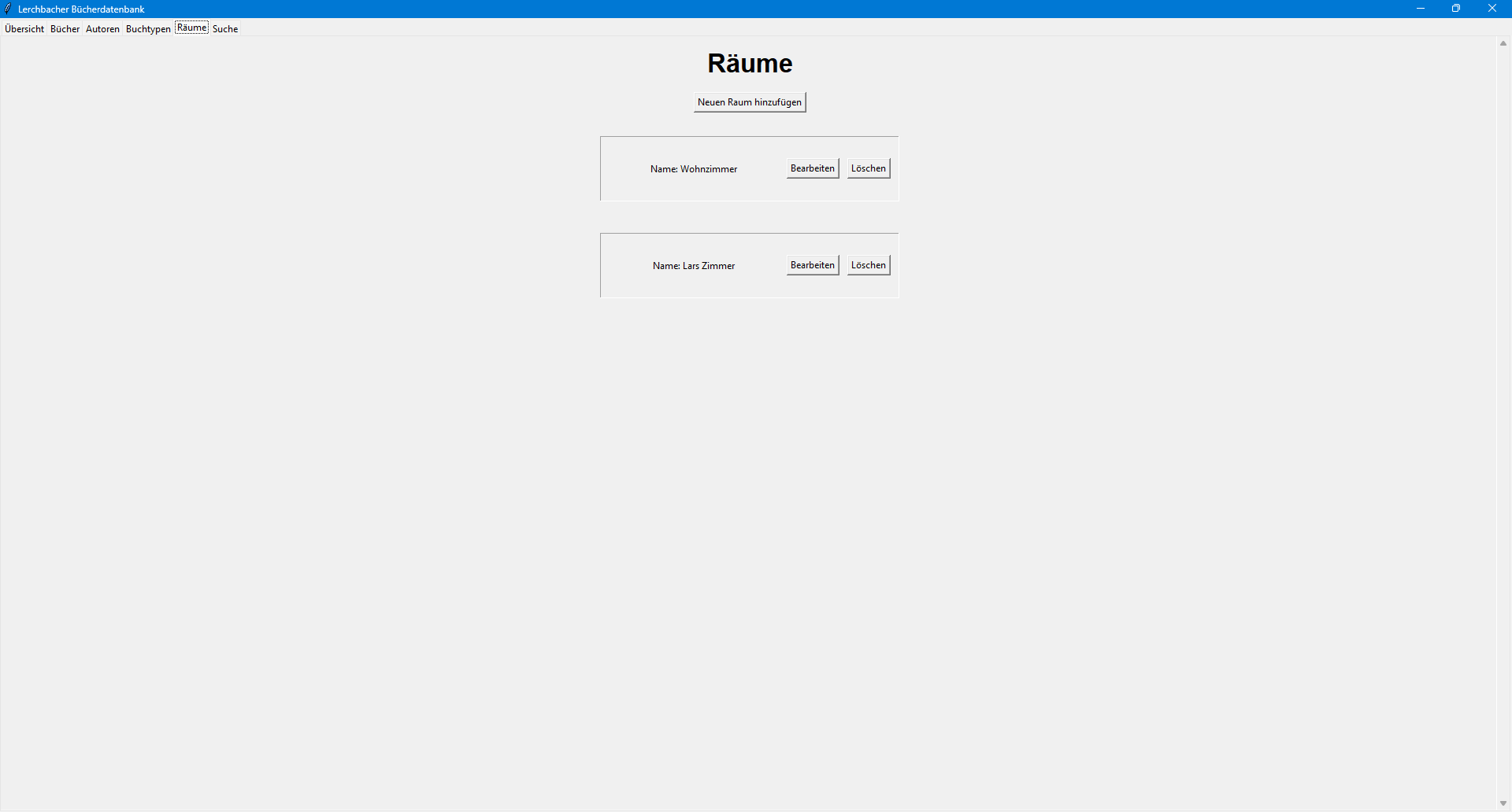 In diesem Tab finden Sie eine Auflistung aller in der Datenbank gespeicherten Räume. über den "Neuen Raum hinzufügen" Knopf könne Sie einen neuen Raum anlegen. über den "Bearbeiten" Knopf neben jedem Raum lässt sich der Name des Raumes ändern und über den "Löschen" Knopf aus der Datenbank entfernen. Das drücken von "Enter", während dieser Dialog geöffnet ist, speichert ebenfalls.